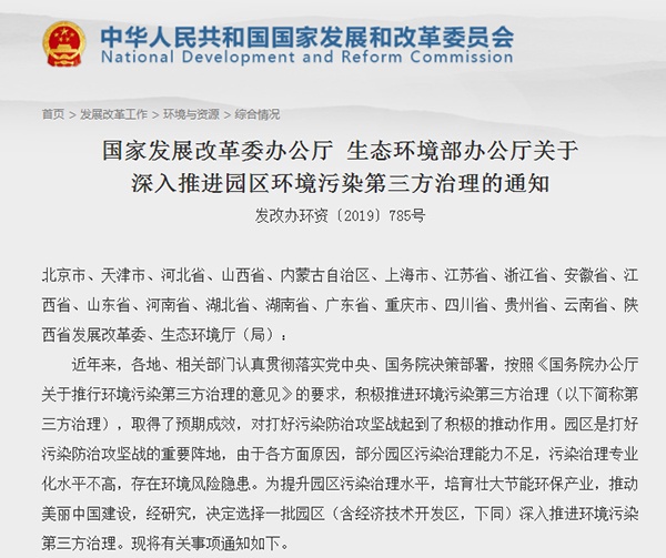 2019年7月11日,國家發(fā)展改革委辦公廳、生態(tài)環(huán)境部辦公廳關(guān)于深入推進(jìn)園區(qū)環(huán)境污染第三方治理的通知,詳情如下: