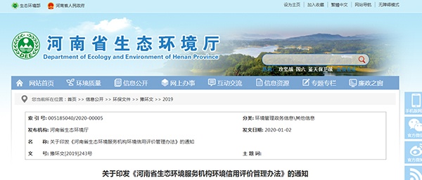 2020年01月02日,河南省生態(tài)環(huán)境廳發(fā)布了關(guān)于印發(fā)《河南省生態(tài)環(huán)境服務(wù)機(jī)構(gòu)環(huán)境信用評(píng)價(jià)管理辦法》的通知,詳情如下: