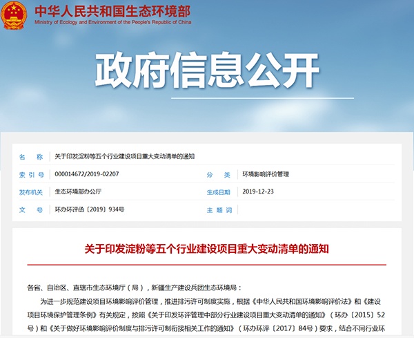 2019年12月23日,生態(tài)環(huán)境部發(fā)布了關于印發(fā)淀粉等五個行業(yè)建設項目重大變動清單的通知,詳情如下: