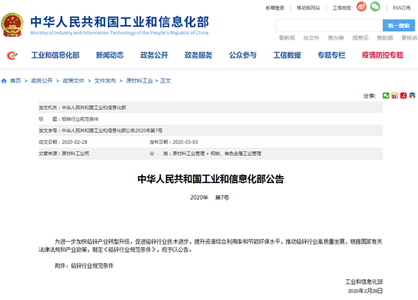2020年3月3日,工業(yè)和信息化部發(fā)布了《鉛鋅行業(yè)規(guī)范條件》,詳情如下: