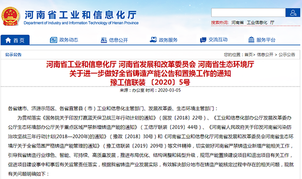 河南省工業(yè)和信息化廳 河南省發(fā)展和改革委員會 河南省生態(tài)環(huán)境廳關(guān)于進(jìn)一步做好全省鑄造產(chǎn)能公告和置換工作的通知豫工信聯(lián)裝 〔2020〕5號