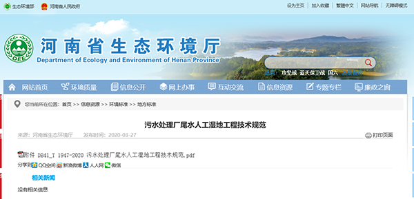 2020年1月21日,河南省生態(tài)環(huán)境廳、河南省市場(chǎng)監(jiān)督管理局聯(lián)合發(fā)布了《污水處理廠尾水人工濕地工程技術(shù)規(guī)范》。自2020年4月21日起實(shí)施。