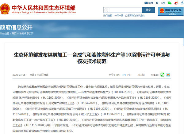 生態(tài)環(huán)境部發(fā)布煤炭加工-合成氣和液體燃料生產等10項排污許可申請與核發(fā)技術規(guī)范
