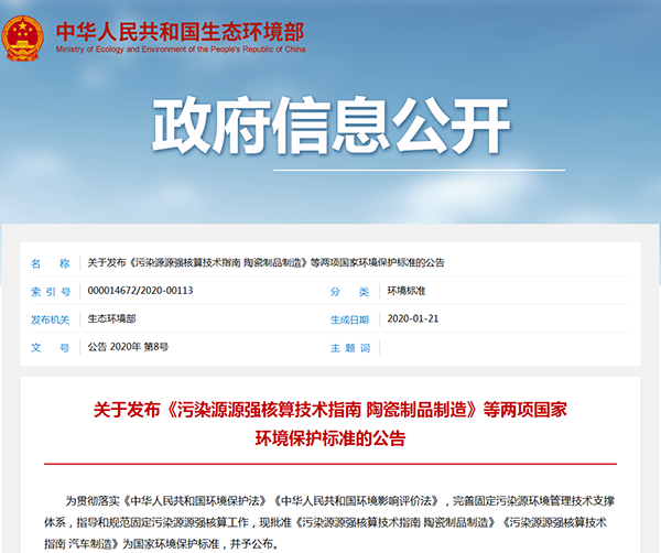 2020年1月21日,生態(tài)環(huán)境部發(fā)布了《污染源源強核算技術指南 陶瓷制品制造》《污染源源強核算技術指南 汽車制造》兩項國家環(huán)境保護標準,詳情如下: