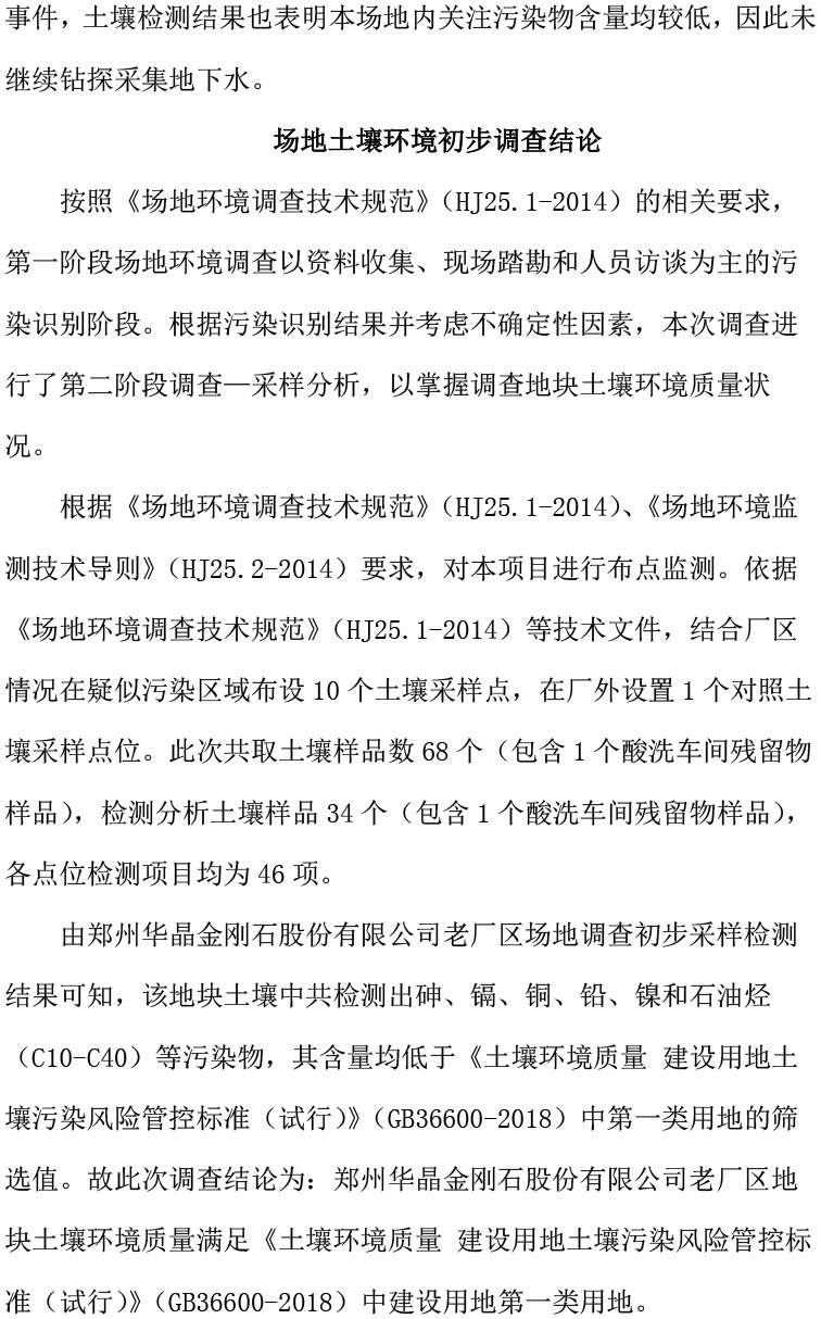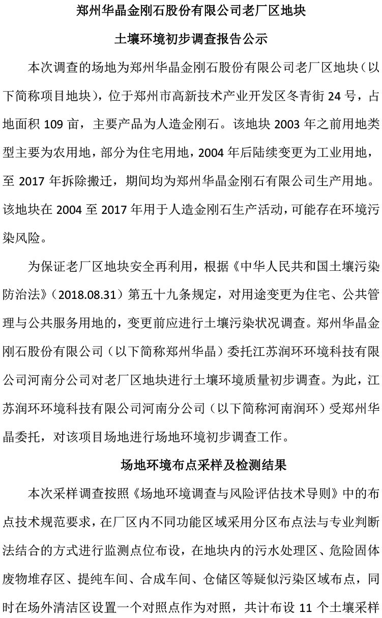 《鄭州華晶金剛石股份有限公司老廠區(qū)地塊土壤初步調(diào)查報告》公示