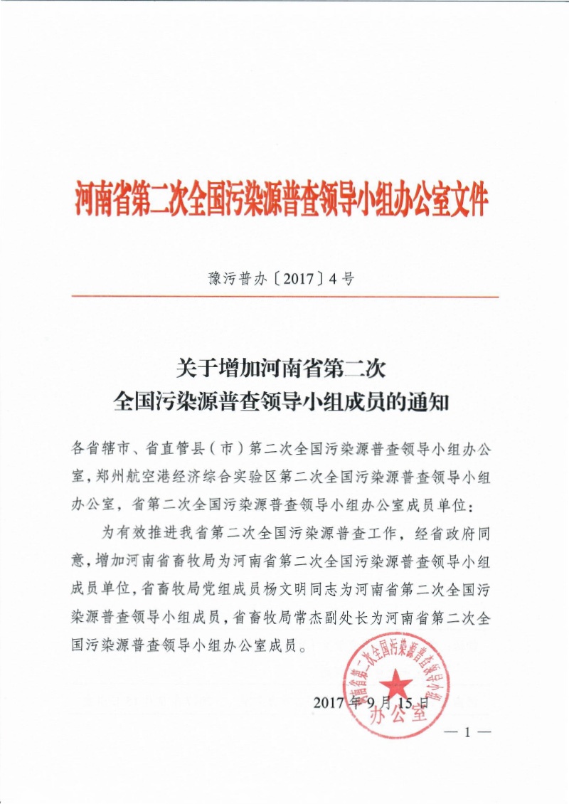豫污普辦【2017】4號(hào)關(guān)于增加河南省第二次全國(guó)污染源普查領(lǐng)導(dǎo)小組成員的通知