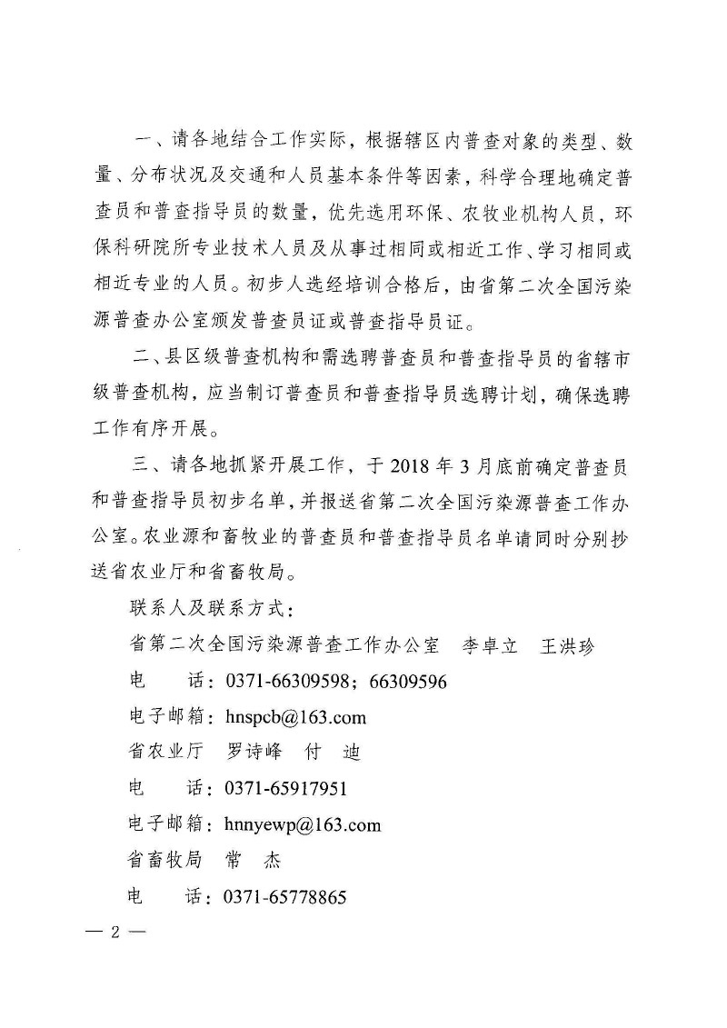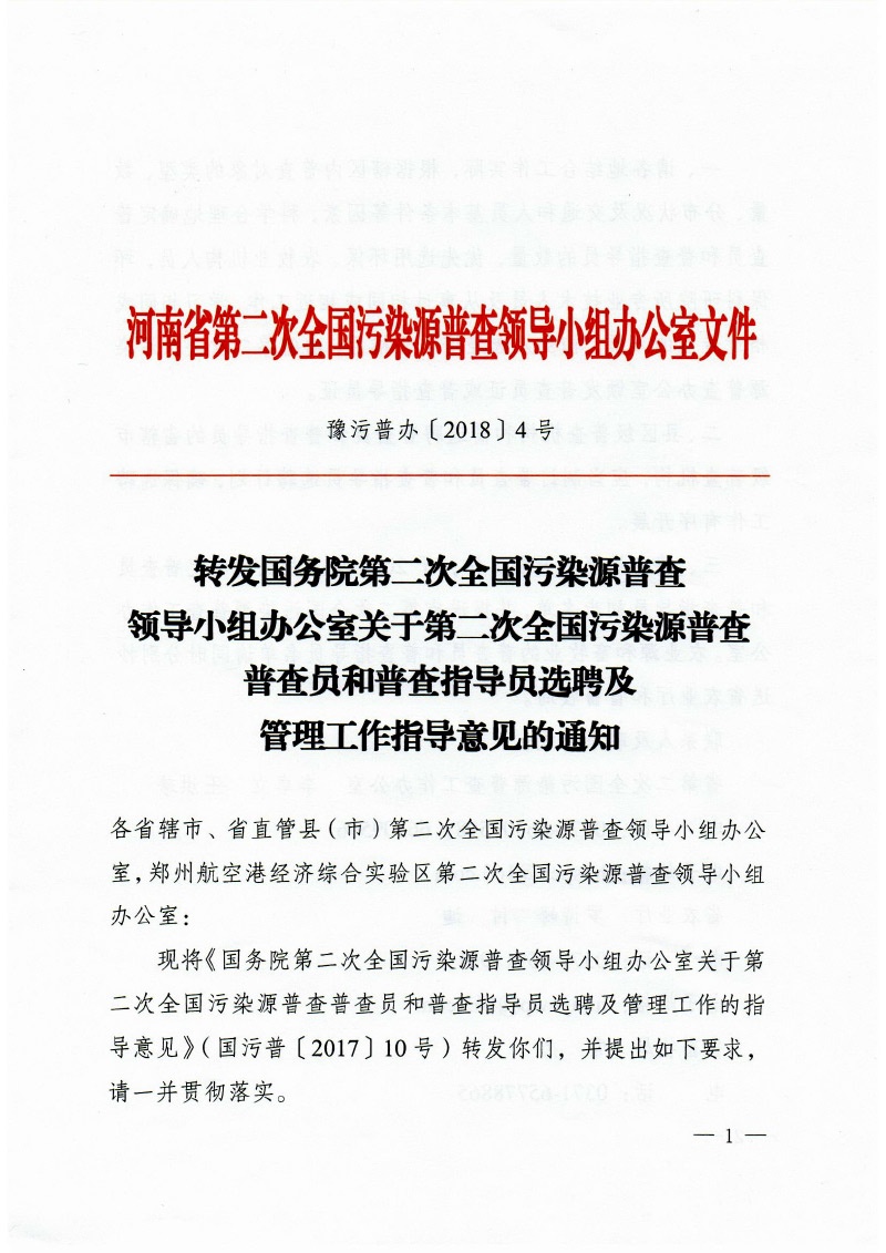 豫污普辦【2018】4號轉發(fā)國務院第二次全國污染源普查領導小組辦公室關于第二次全國污染源普查普查員和普查指導員選聘及管理工作指導意見的通知