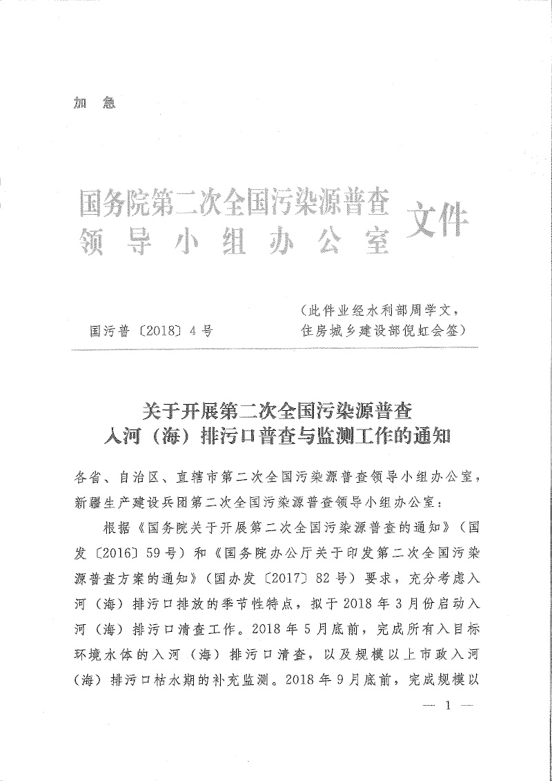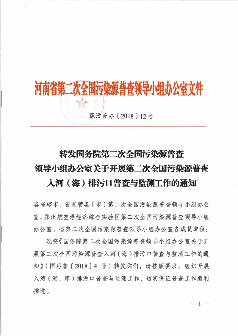 豫污普辦【2018】12號轉(zhuǎn)發(fā)國務(wù)院第二次全國污染源普查領(lǐng)導(dǎo)小組辦公室關(guān)于開展第二次全國污染源普查入河(海)排污口普查與監(jiān)測工作的通知