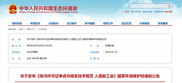 生態(tài)環(huán)境部關(guān)于發(fā)布《排污許可證申請與核發(fā)技術(shù)規(guī)范 人造板工業(yè)》國家環(huán)境保護(hù)標(biāo)準(zhǔn)的公告