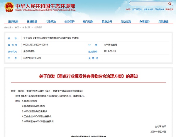 2019年6月26日,生態(tài)環(huán)境部發(fā)布了《重點行業(yè)揮發(fā)性有機物綜合治理方案》,詳情如下: