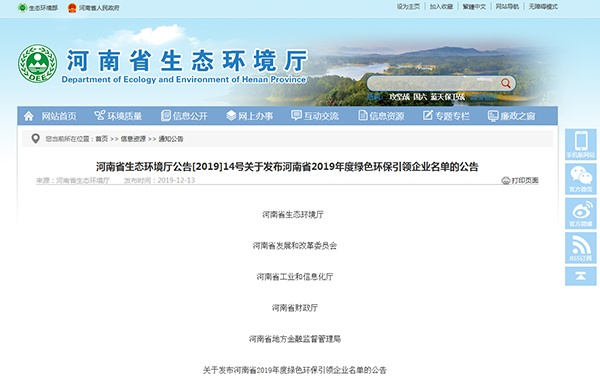 河南省生態(tài)環(huán)境廳公告〔2019〕14號(hào)關(guān)于發(fā)布河南省2019年度綠色環(huán)保引領(lǐng)企業(yè)名單的公告