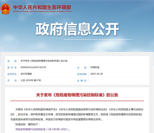 2019年10月10日,生態(tài)環(huán)境部發(fā)布了《危險(xiǎn)廢物填埋污染控制標(biāo)準(zhǔn)》,詳情如下: