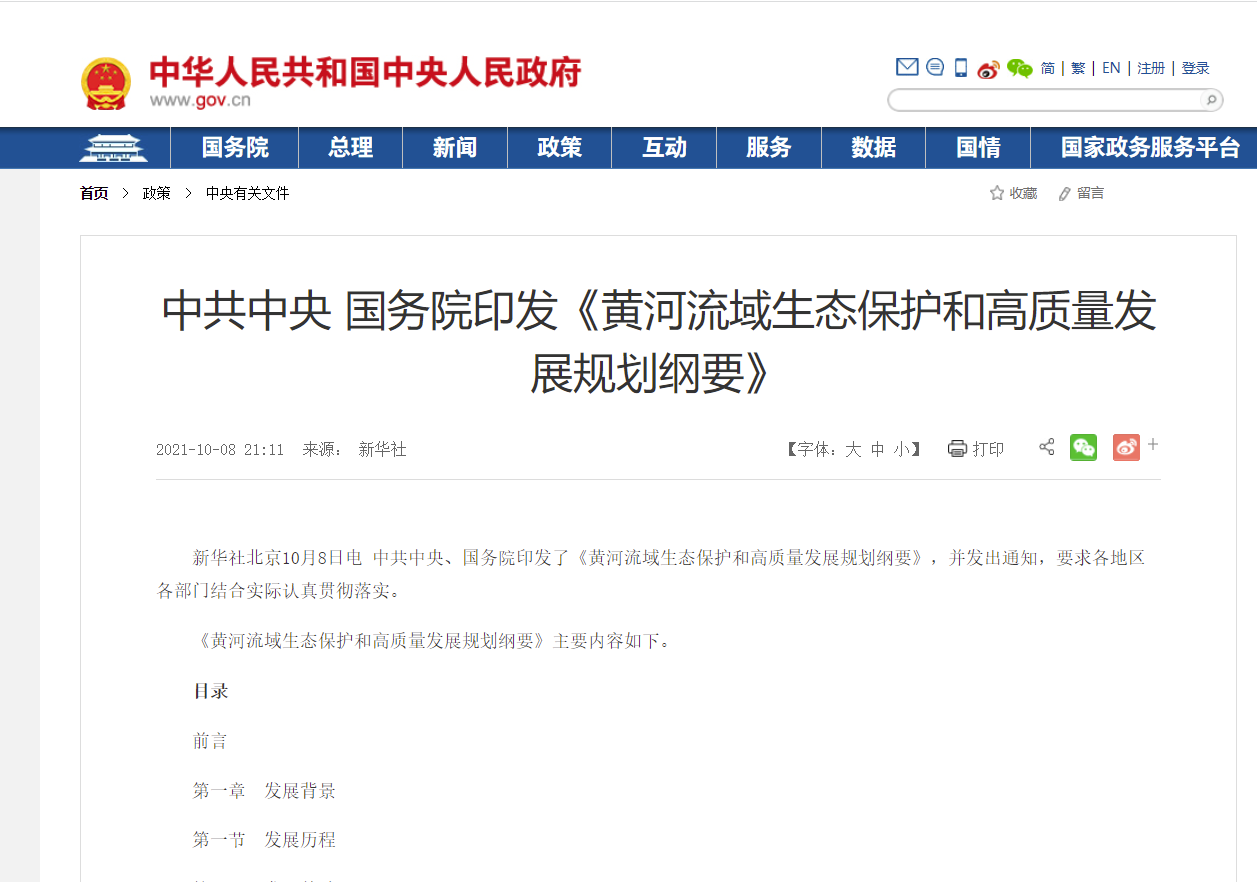 新華社北京10月8日電 中共中央、國務(wù)院印發(fā)了《黃河流域生態(tài)保護(hù)和高質(zhì)量發(fā)展規(guī)劃綱要》,并發(fā)出通知,要求各地區(qū)各部門結(jié)合實(shí)際認(rèn)真貫徹落實(shí)。