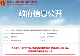 2020年3月9日,生態(tài)環(huán)境部發(fā)布了《排污許可證申請與核發(fā)技術(shù)規(guī)范 金屬鑄造工業(yè)》等五項國家環(huán)境保護標準