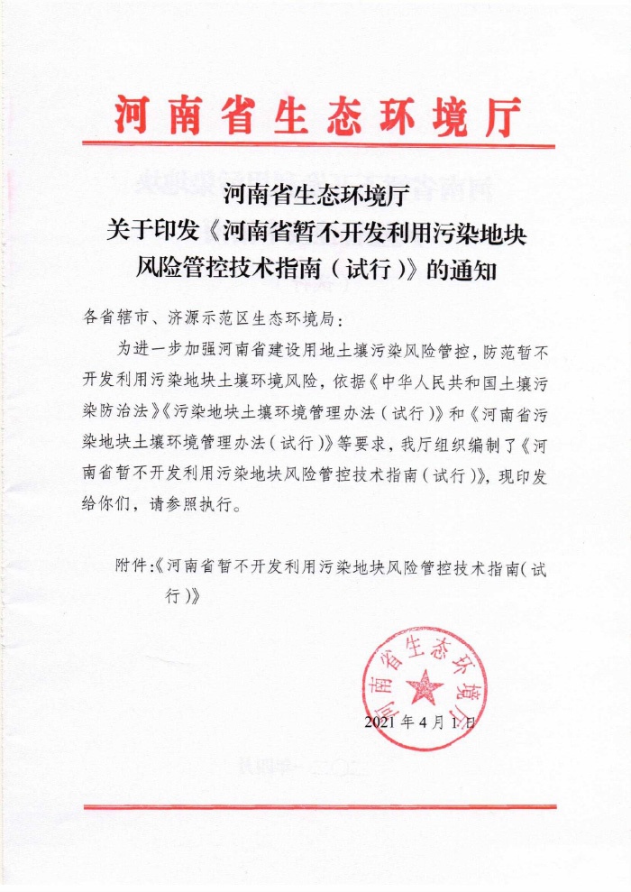 2021.4.1關(guān)于印發(fā)《河南省暫不開發(fā)利用污染地塊風(fēng)險管控技術(shù)指南(試行)》的通知